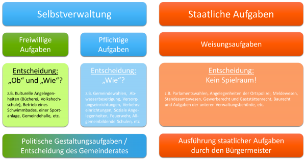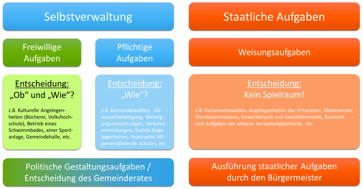 Der Gemeinderat erlässt nicht nur Rechtsvorschriften (Satzungen), wählt das Führungspersonal und kontrolliert die Verwaltung, sondern fällt auch Einzelfallentscheidungen, weist die Verwaltung an und stellt das gesamte Gemeindepersonal ein (sofern diese Aufgabe nicht, bis zu einer gewissen Gehaltsgruppe etwa, dem Bürgermeister übertragen wird). Die Domäne des Bürgermeisters sind demgegenüber „die Geschäfte der laufenden Verwaltung“ (§ 44 Abs. 2 GemO). Hinzu kommen Aufgaben, die dem Bürgermeister von Gesetzes wegen übertragen sind. Zusätzlich kann der Gemeinderat an den Bürgermeister einzelne Aufgaben delegieren.